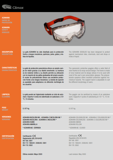 - La gafa AZAHARA ha sido diseñada para la protección frente a riesgos mecánicos, químicos, polvo, gotas y nieblas de líquidos. Ofrece un amplio campo de visión gracias a su diseño envolvente. La montura es de material vinílico y su diseño permite su utilización con la mayoría de las gafas graduadas del propio usuario. El ocular de policarbonato ofrece una excelente proteccción frente a los riesgos mecánicos. La banda de sujeción es ajustable para adaptarse a la diferente morfología de los usuarios. Peso: 0,107 kg.