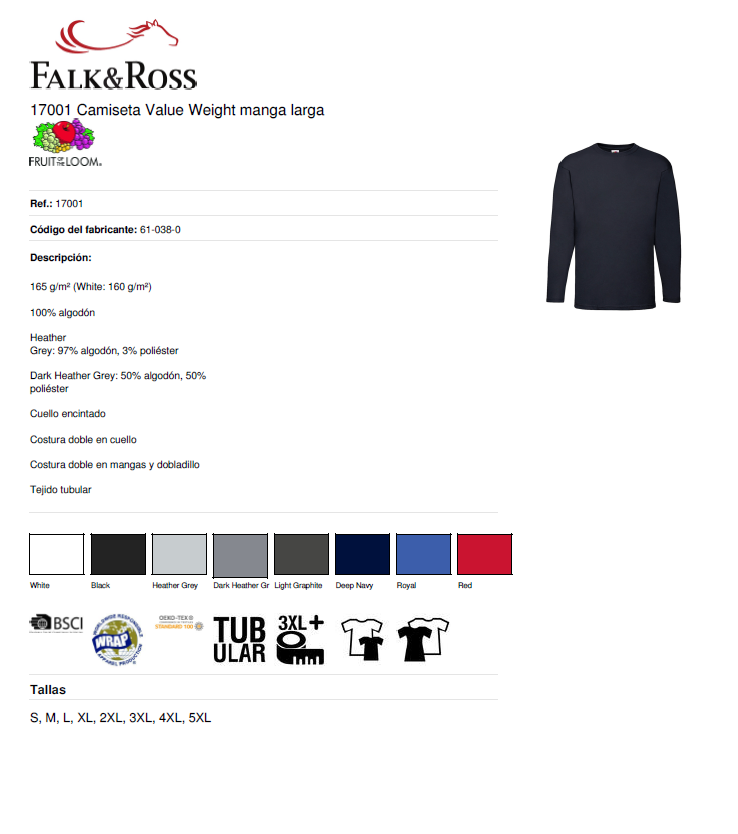 165 g/m² (White: 160 g/m²)100% algodónCuello encintadoCostura doble en cuelloCostura doble en mangas y dobladilloTejido tubularCAMISETA VALUE WEIGHT MANGA LARGA4,47 €PrecioTALLASElegirColoresAZUL MARINOCantidad*Agregar al carritoRealizar compraFICHA TÉCNICAVER