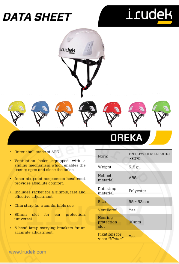Irudek presenta la nueva generación del popular casco Ekain. Esta nueva generación partirá con nuevo nombre, Oreka, el equilibrio perfecto entre seguridad, comodidad y diseño. Certificado bajo la norma EN397:2012+A1, este casco cumple todos los puntos obligatorios de la norma EN397-cascos de protección para la industria- , por lo que el operario estará protegido durante cualquier tipo de trabajo que realice en un entorno industrial. Este nuevo modelo estará disponible en 8 colores: blanco, negro, amarillo, rojo, verde, azul, naranja y rosa.