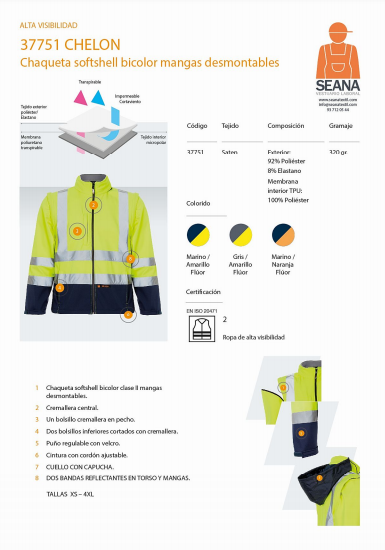 Chaqueta softshell bicolor clase II mangas desmontables, cremallera central, 1 bolsillo cremallera en pecho, 2 bolsillos inferiores cortados con cremallera, puño regulable con velcro, cintura con cordón ajustable, cuello con capucha. 2 bandas reflectantes en torso y mangas.