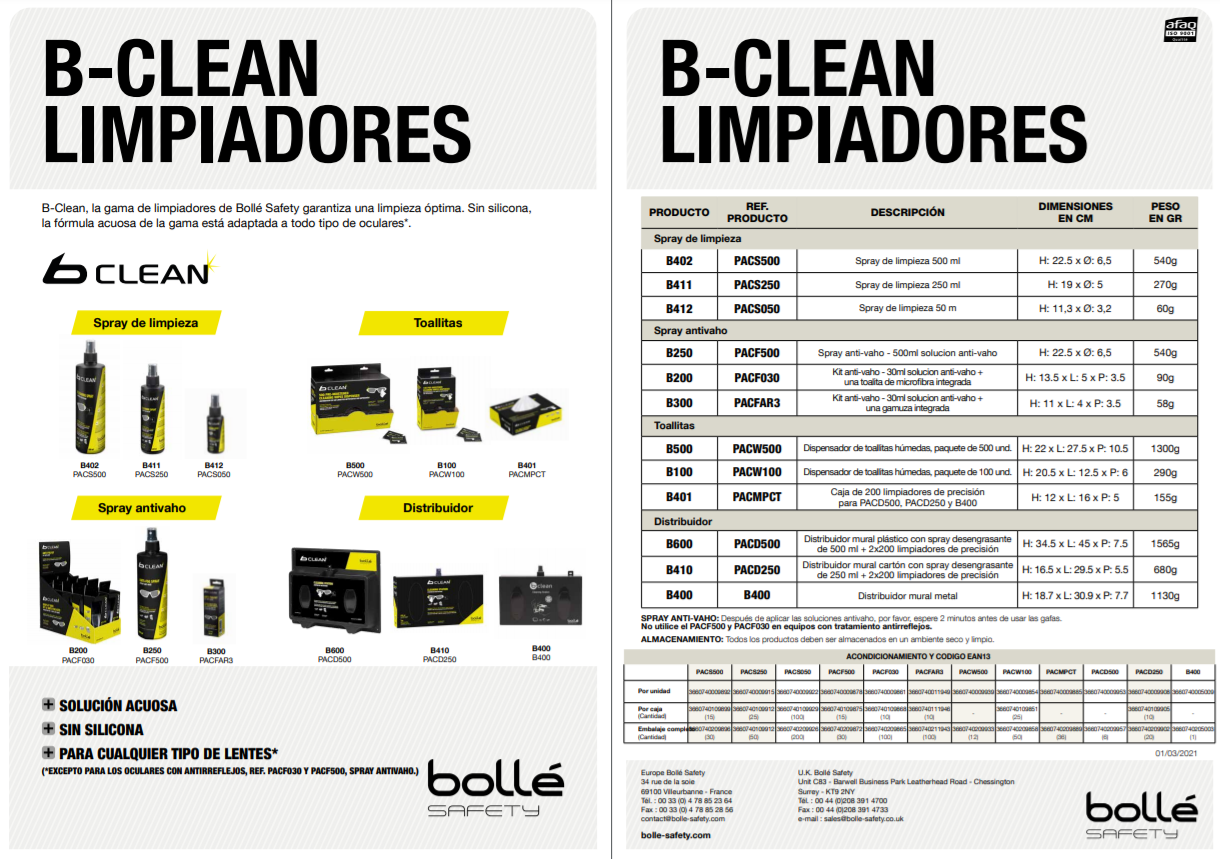 Certificada por el laboratorio COLTS, B-Clean, la nueva gama de limpiadores de Bollé Safety garantiza una limpieza óptima. Sin alcohol, sin silicona, la fórmula acuosa de la gama está adaptada a todos los oculares*.