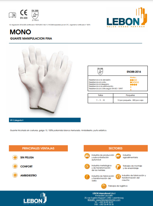 Guante tricotado sin costuras, galga 13, 100% poliamida blanca texturada. Ambidiestro, puño elástico.MONO LEBON (12 PARES)SKU: MONO9,48 €PrecioTallas:ElegirCantidad*Agregar al carritoRealizar compraCARACTERÍSTICAS Ambidiestro Confort Desteridad Manipulación fina FICHA TÉCNICAVER CERTIFICACIÓNVER