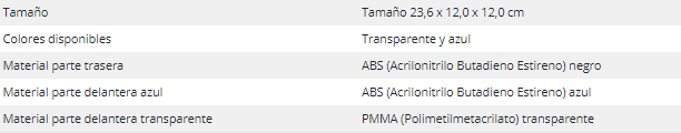- Disponible en dos colores: azul y transparente