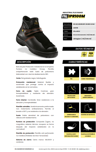 Bota de piel y serraje. Protección metatarsal en el empeine. Puntera no metálica Vincap. Plantilla antiperforación textil. Suela de poliuretano bidensidad con nivel de deslizamiento SRC.BOTA VULCANO TOP METATARSAL FAL56,69 €PrecioColoresNEGROTALLASElegirCantidad*Agregar al carritoRealizar compraCERTIFICACIÓN:VER FICHA TÉCNICA:VER